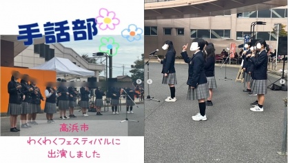 2025-11-11お知らせ 手話部 高浜市わくわくフェスティバルに出演しました。 手話部が高浜市わくわくフェスティバルに出演しました。 ステージは普段は歩けない三河高浜駅前ロータリーです。 会場のみなさんと一緒に音楽に合わせて手話をしました。 これにて手話が大好きな3年生が部活動を引退します。 手話部を支えてくださった地域の皆様、ありがとうございました。