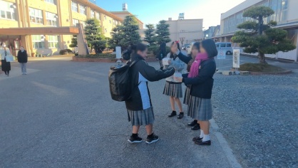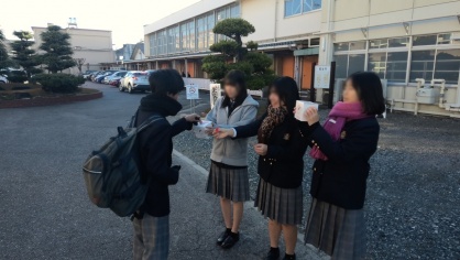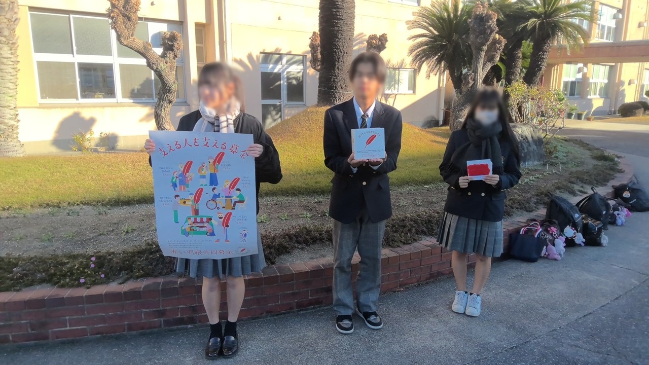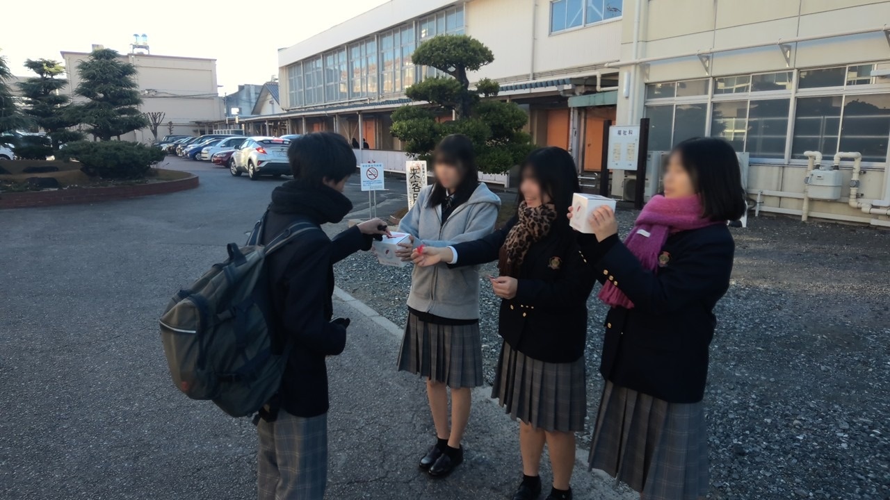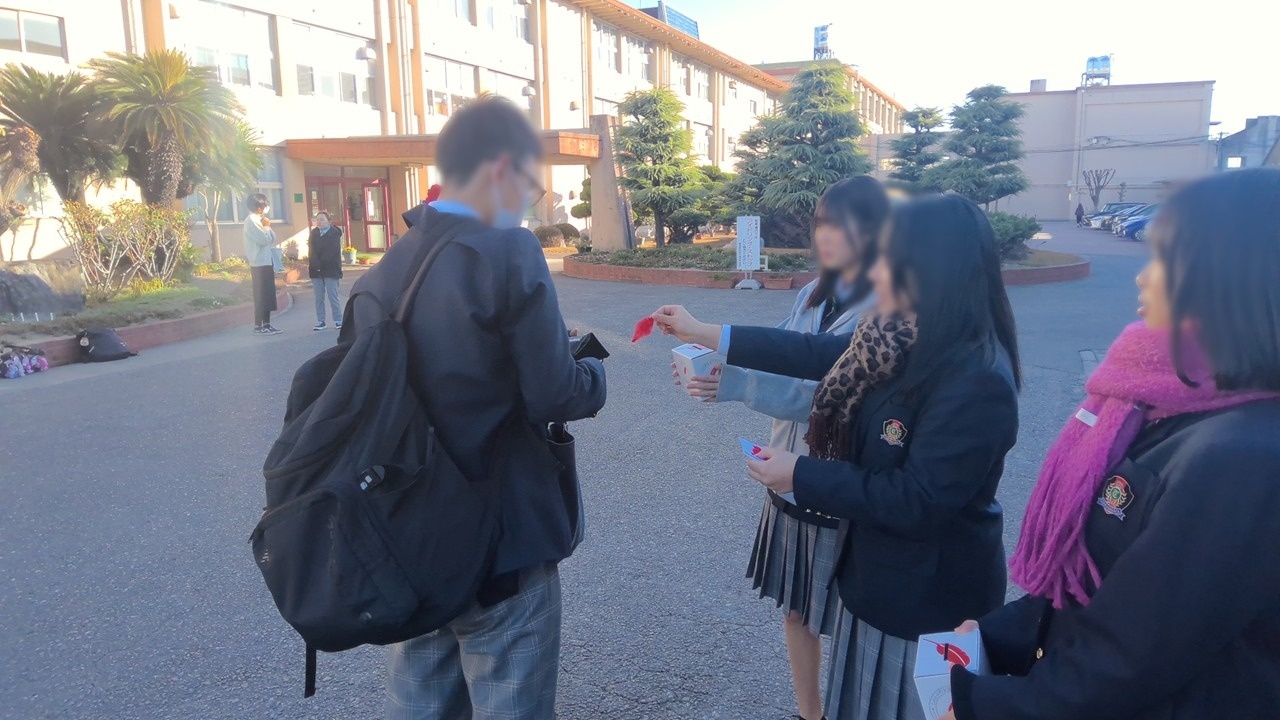 2025-12-09お知らせ 赤い羽根共同募金の活動を行いました。 今年度の赤い羽根共同募金も「つながりをたやさない社会づくり~あなたは一人じゃない~」を全国共通助成テーマとして実施されています。 昨日、生徒会役員が校内放送で説明を行い、本日、登校する生徒に募金を呼びかけました。多くの先生、生徒から募金の協力がありました。ありがとうございました。