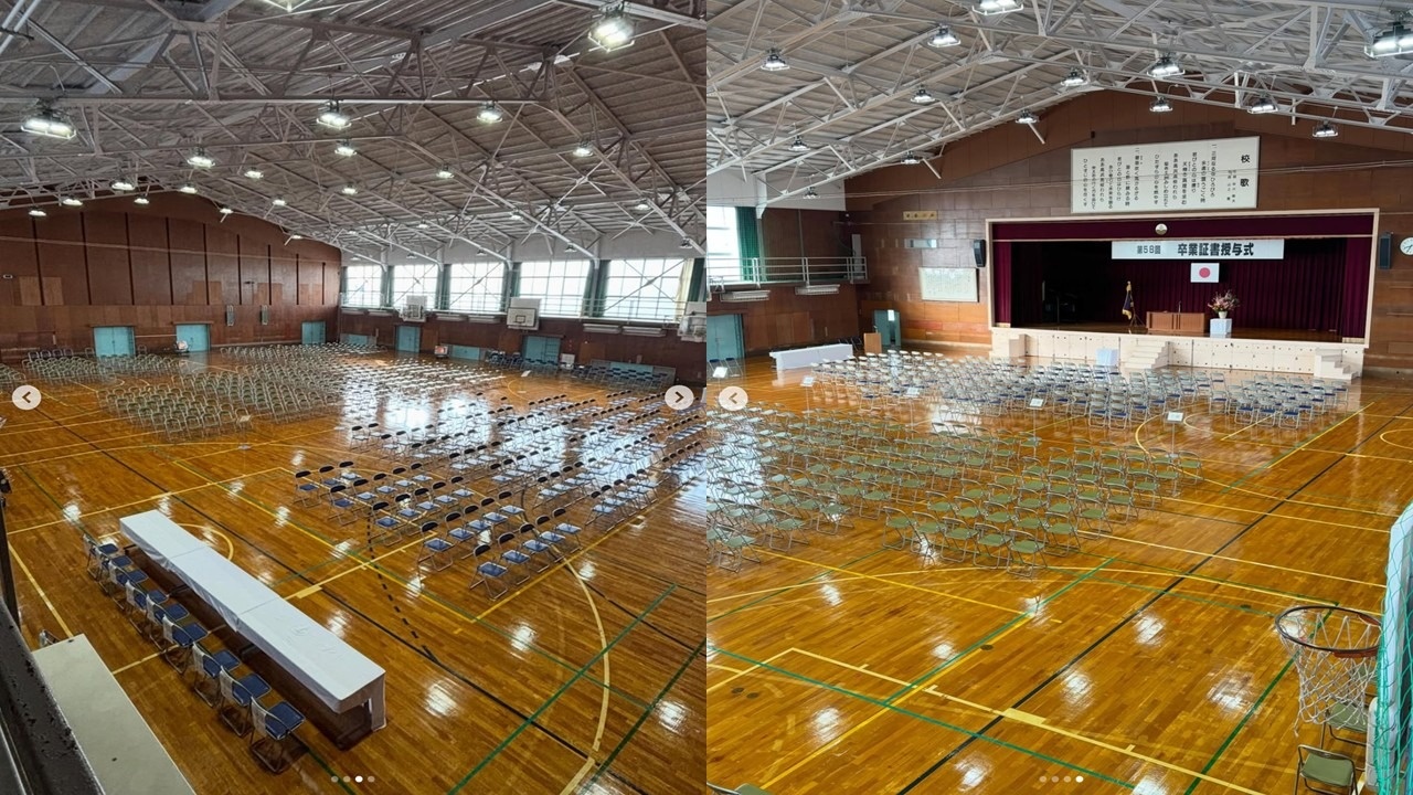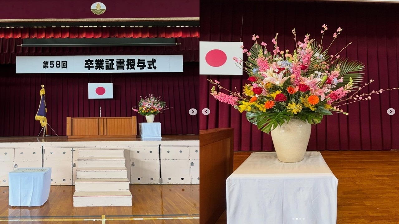卒業生のみなさん、ご卒業おめでとうございます。会場もお花がセッティングされて、華やかになりました。あとは、主役(卒業生)が来るのを待つだけ。